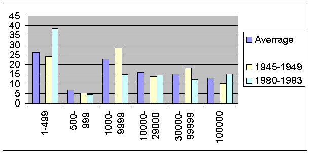 Graph 1, below, is based on SPRU data, for the periods 1945-49 and 1980-83 the share of innovations gainded by firms in six size categories. Maybe the most notable feature of the data is the increasing share of national innovations taken by small and medium-sized enterprises. The innovation share increased from 24.3 per cent during 1945-49, to 38.4 per cent during 1980-83.